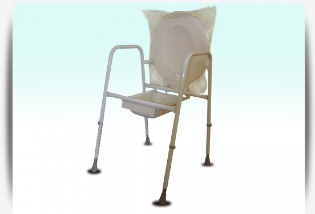 Estructura de acero robusta, elevable en altura, con apoyabrazos. Terminación: pintado. Color: blanco. Asiento y tapa rebatibles y desmontables. Incluye bacinilla plástica con tapa y manija.